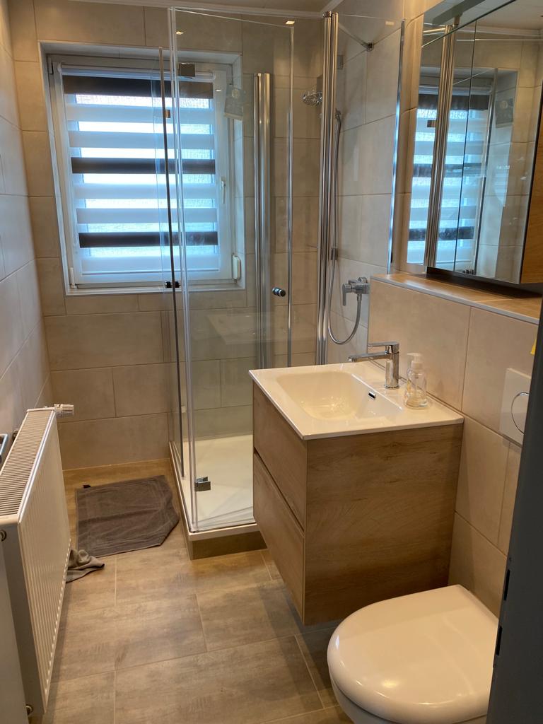 Dusche, Toilette, Waschbecken, Fön, Handtücher, Badetücher, Wasserbecher, Toilettenpapier