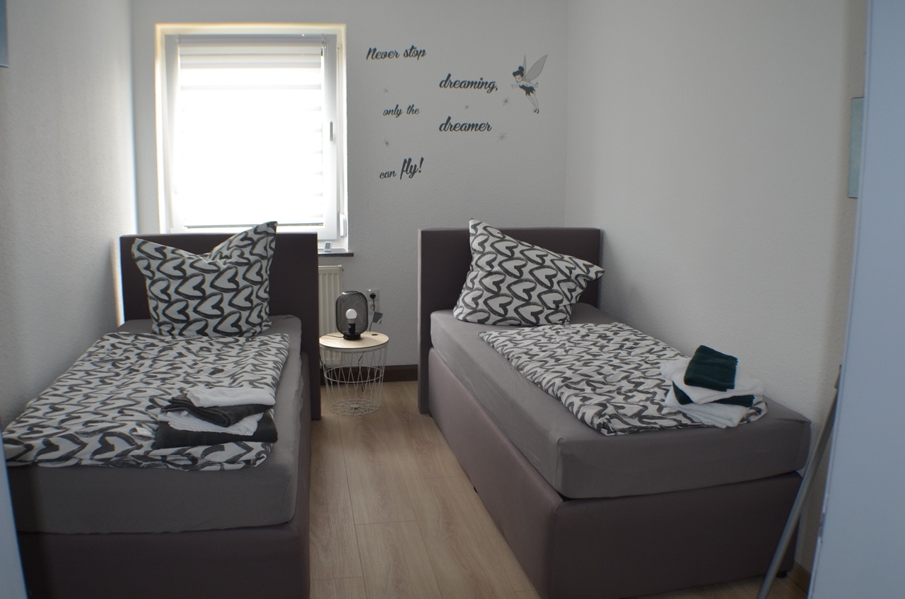 2 Einzelbetten mit Rausfallschutz (für Kids) ,Bettwäsche, rollbarer Kleiderschrank